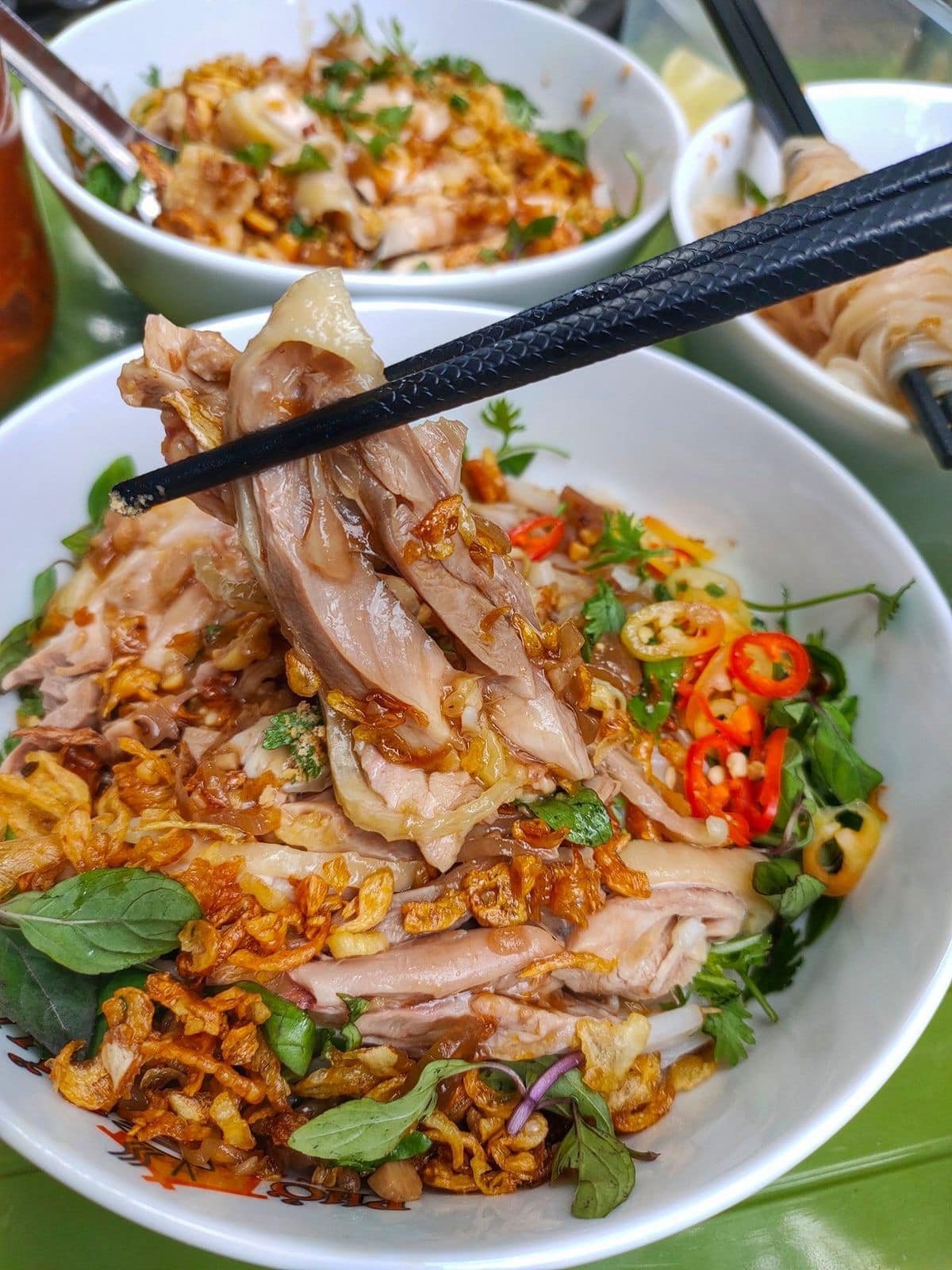Start your tour with one of Hanoi’s most beloved breakfast dishes. Xôi Xéo is made from glutinous rice topped with smashed mung beans, crispy fried shallots, and a drizzle of chicken fat. Served with optional sides like boiled chicken or pork.