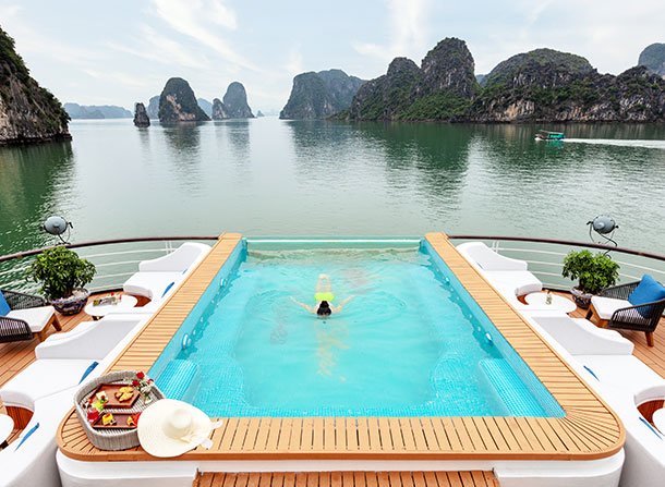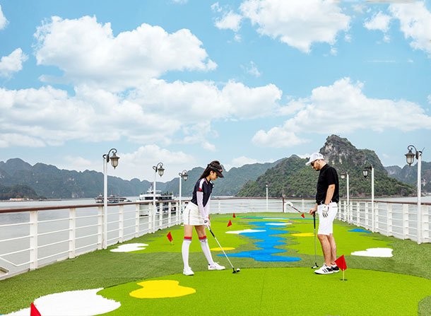 In particular, this is also a yacht with a golf course in Ha Long that can make golfers feel satisfied. The golf course on the yacht is designed quite eye-catching with a 360-degree view so that visitors can both play golf and admire the beautiful scenery on the bay from every angle.